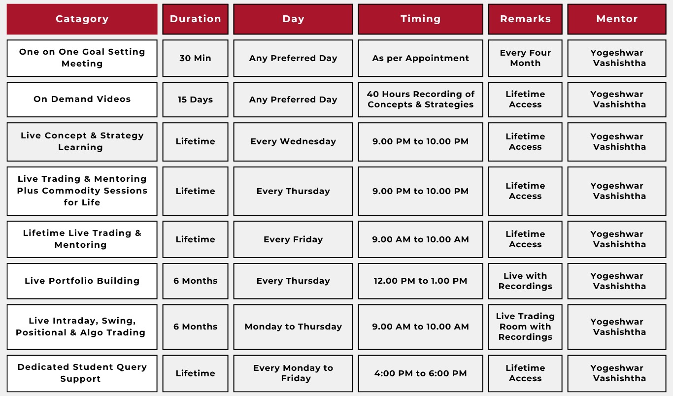 Commodity Live Trading & Mentoring Sessions for Life: Conducted every Thursday, 9:00 PM – 10:00 PM, this session focuses on practical commodity trading strategies. It also includes a live Q&A segment to clarify doubts and strengthen market understanding.